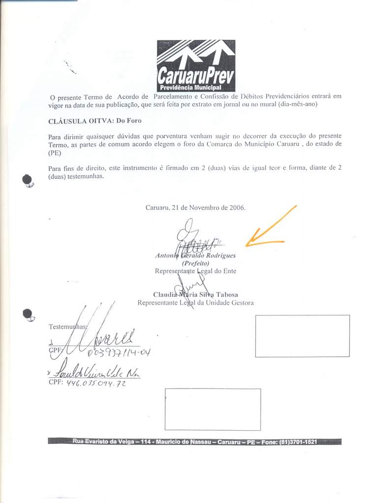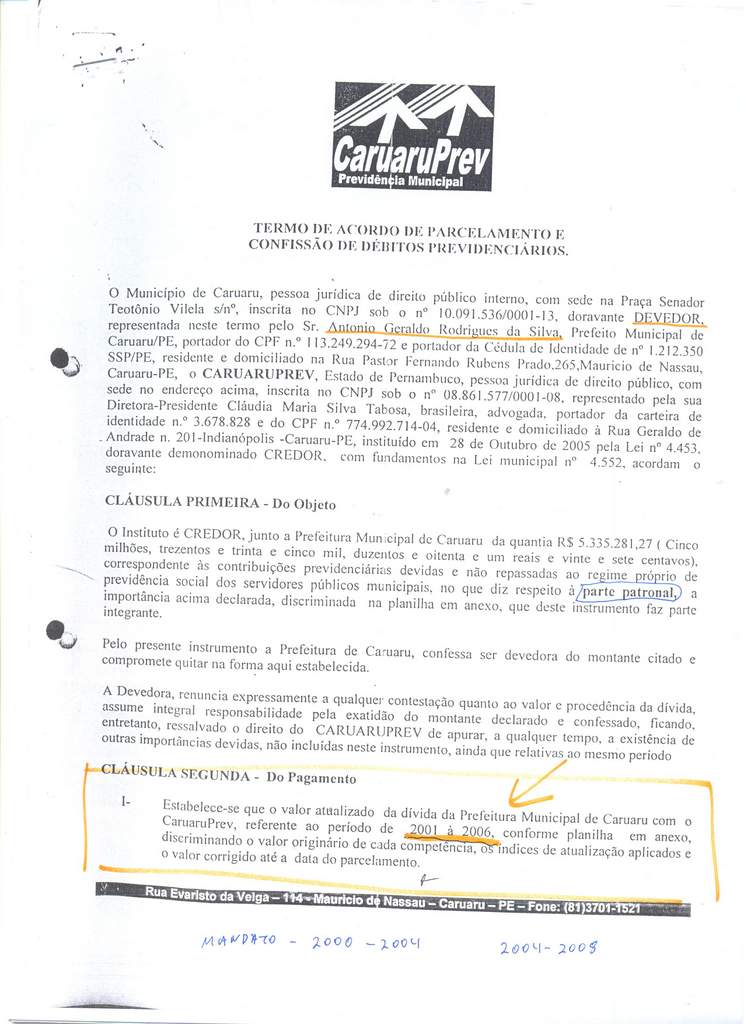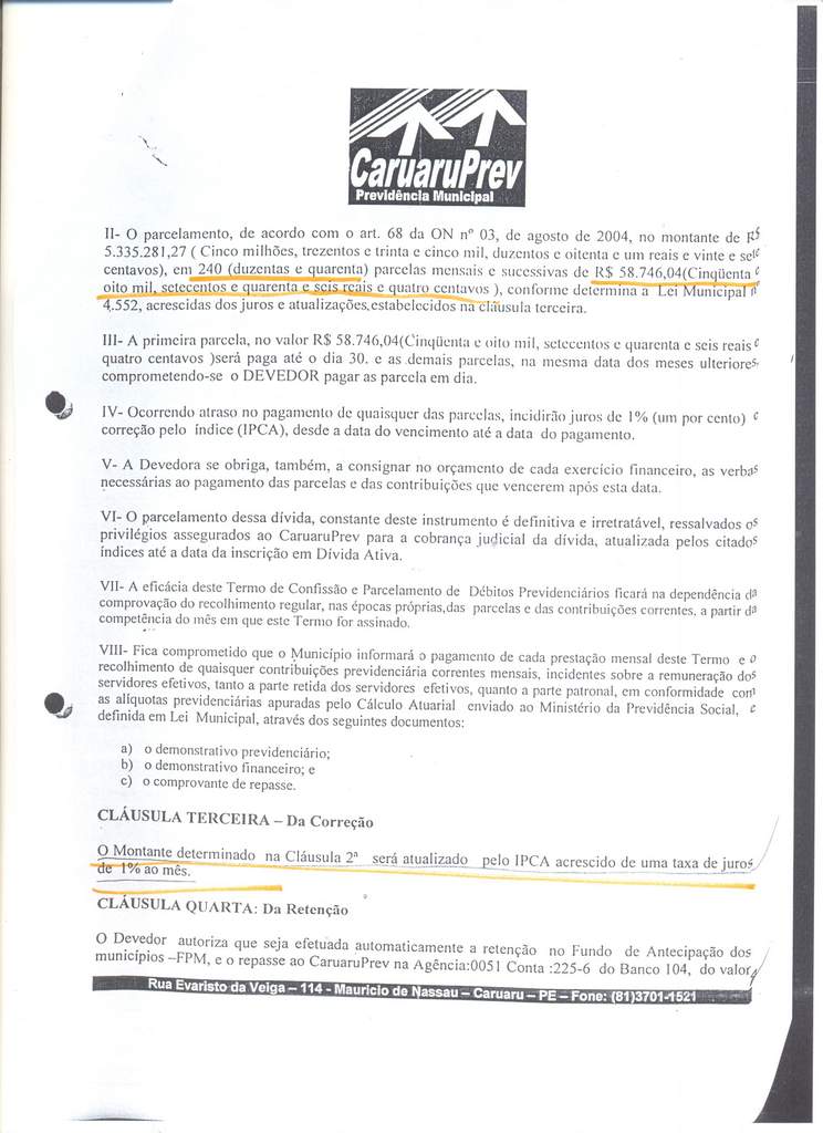Segue abaixo a confissão de dívida assinada pelo próprio ex-prefeito, com parcelamento do débito em 240 prestações de R$ 58,7 mil